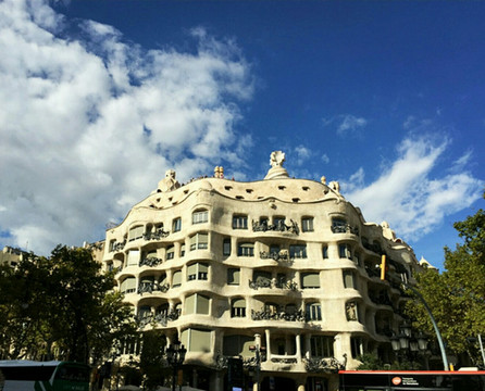 Casa Batllo巴特罗之家,高迪的名言“直线属于人类、曲线属于上帝”在这处以海洋概念设计的公寓里体现得淋漓尽致,几乎全都是曲线弧线的设计。据说当地人把它叫作casa dels ossos(骨头房子)和casa del drac(龙之屋),主要是由于它的外墙表面有着数个像面具般的阳台、人骨状的细柱,另外还有像巨龙脊背的屋顶瓦墙。它的外墙全部是由蓝色和绿色的陶瓷装饰的,一种奇诡的颜色组合,远望去颇象印象派画家的调色盘,但色彩很和谐。