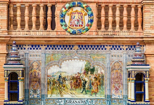 建筑的底部,有58组瓷片构成的壁画。们分别代表西班牙的各个省份,每个省份的花砖画上,都讲述着跟这一地区有关的历史和故事。