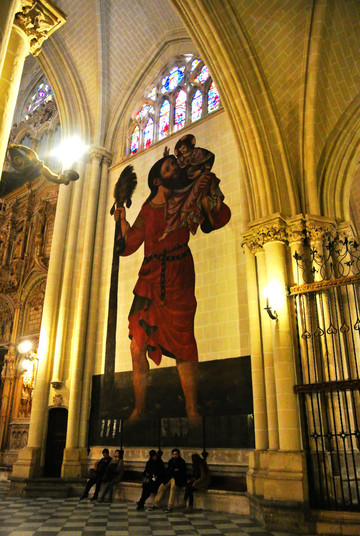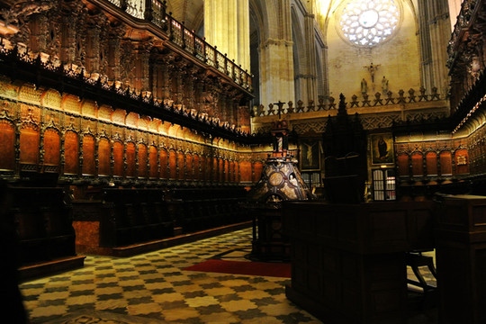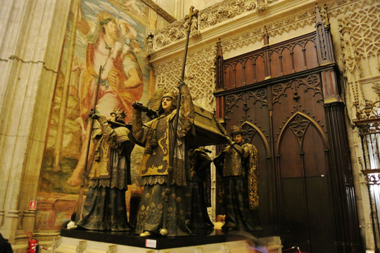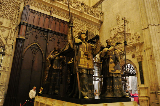 塞维利亚大教堂也许更为出名的地方不在于它是欧洲第三大教堂而在于哥伦布的棺木就在这个教堂之中,大航海时代的四个西班牙王国:卡斯蒂利亚Castila、Leon、Aragon和Navarra 肩扛着哥伦布的灵柩,伫立在教堂最醒目的位置。