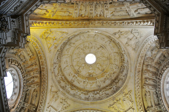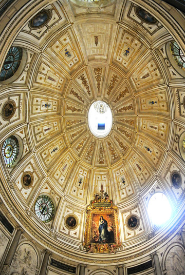 主祭坛后部往上看,顶部这处天窗般的设计令人眼前一亮,洞外穹顶是天堂般景象的绘画,而洞口守护着的则是12使徒的雕像。