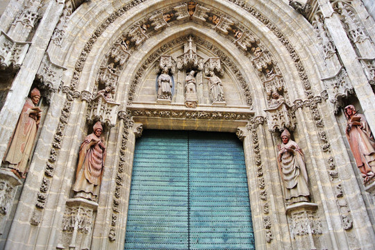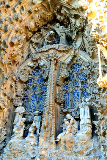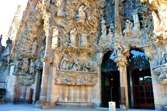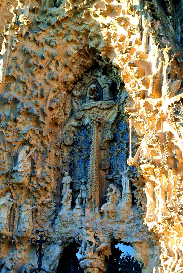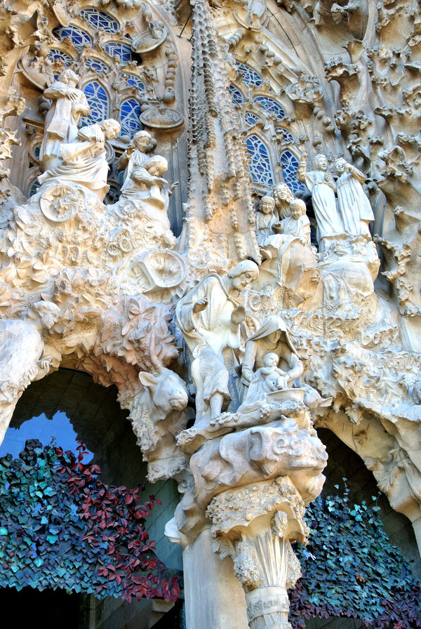 诞生立面的雕塑群。诞生立面是高迪生前设计建造,人物造型接近真人形态,很惟妙惟肖。该立面除了人物,上面还有很多植物形态花纹和浮雕在上面。