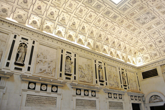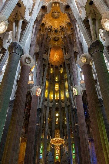 教堂内有 5 个纵向和 3 个横向的中殿,中间靠前的位置是圣坛。必须要在大殿内的不同中殿抬头仰看,360度全方位好好欣赏这个绝世的艺术建筑的天花顶部。