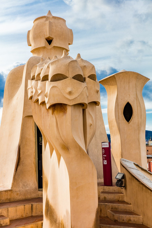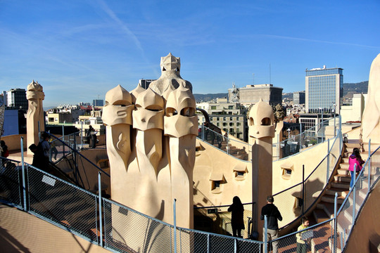 高迪在米拉公寓房顶上造了一些奇形怪状的突出物,有的像披上全副盔甲的军士,有的像神话中的怪兽,有的像教堂的大钟。其实,这是特殊形式的烟囱和通风管道。