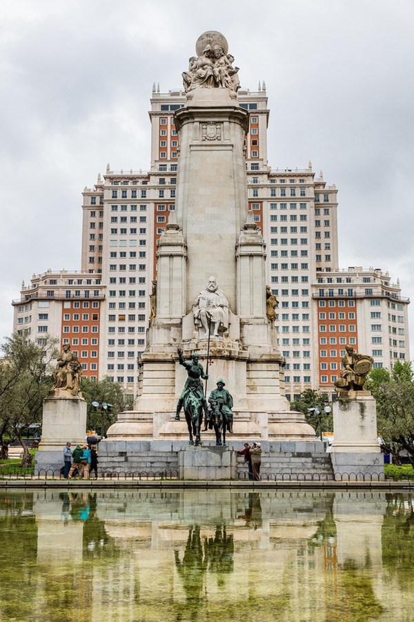 马德里的呈长方形,广场附近和四周林立的高楼,青翠欲滴的树木,把广场圈在中间,使街心广场像一个美丽的绿色庭院。为了纪念塞万提斯这位著名的作家,西班牙建了不少纪念碑,其中最突出的就是西班牙广场中心的塞万提斯纪念碑和唐吉诃德塑像。这个广场因塞万提斯而出名,因此人们又称它为塞万提斯广场。