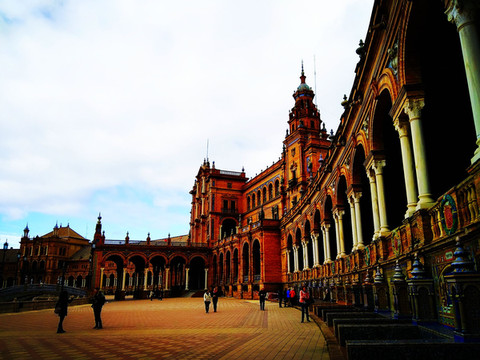 塞维利亚的西班牙广场是最美的西班牙广场。该广场由建筑师阿尼巴尔设计,由一栋呈半弧形的红砖建筑环绕,位于中央的是主塔,弧形两端则为副塔。广场周边的建筑呈半圆形,两侧各有一座塔楼。建筑外部用大量上光瓷砖镶嵌装饰。
