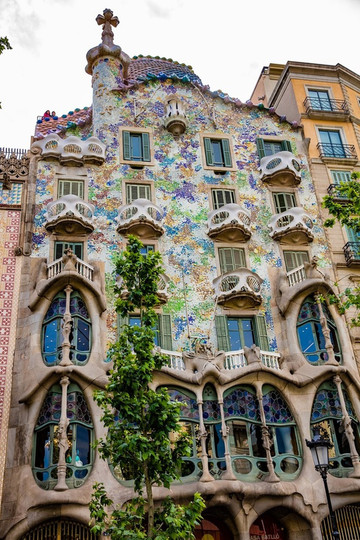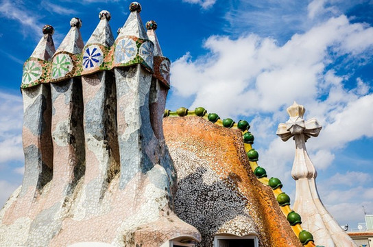 巴特罗之家本身就是一个故事。一位美丽的公主被龙困在城堡里,加泰罗尼亚的英雄圣.乔治为了救出公主与龙展开了搏斗,用剑杀死了龙。龙的血变成了一朵鲜红的玫瑰花,圣乔治把它献给了公主。高迪的灵感来源于此,所以这座房子的每一个设计都有着特殊的含义。十字架形的烟囱代表英雄,鳞片状拱起的屋顶是巨龙的脊背,镶嵌彩饰的玻璃和构思独特的阳台则是面具,人骨造型的支架一点也没有给人阴森的感觉,阳光照耀下色彩缤纷的拼贴玻璃叫人眼花缭乱……