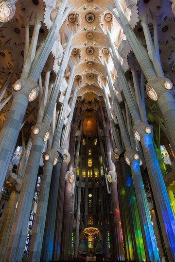 教堂的内部设计与众不同,它由曲线和曲面构成,并以螺旋、锥形、抛物线的各种变化组合成充满韵律动感的建筑风格。所有立柱都犹如树干、树枝及树眼,这都源于大自然给予高迪的设计灵感。