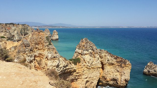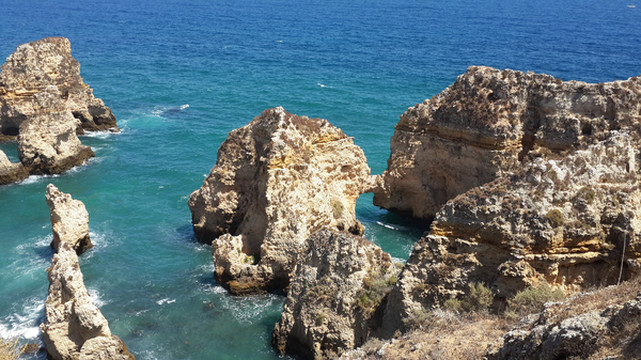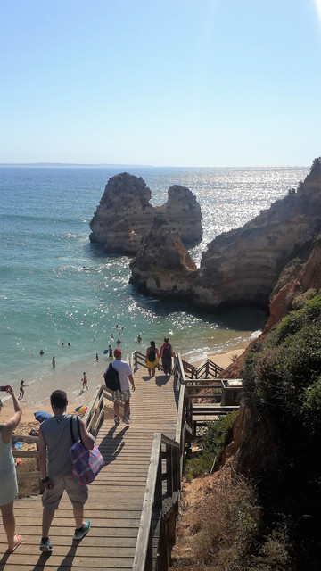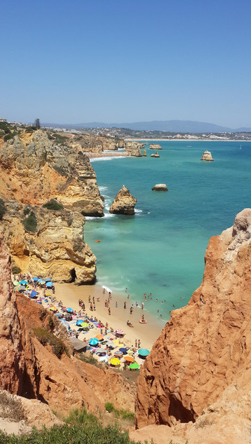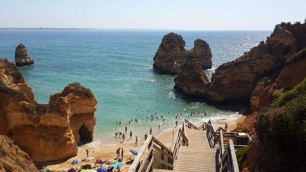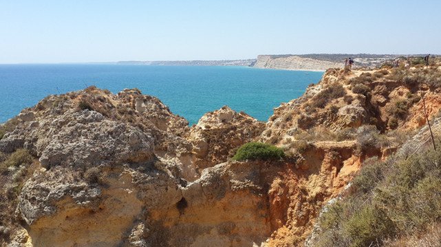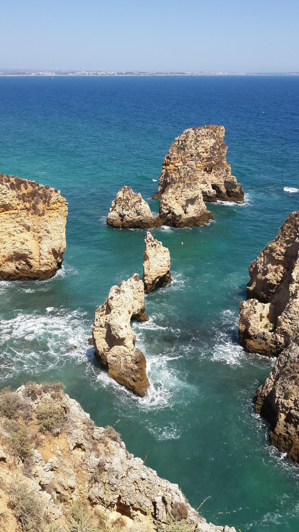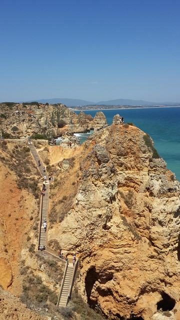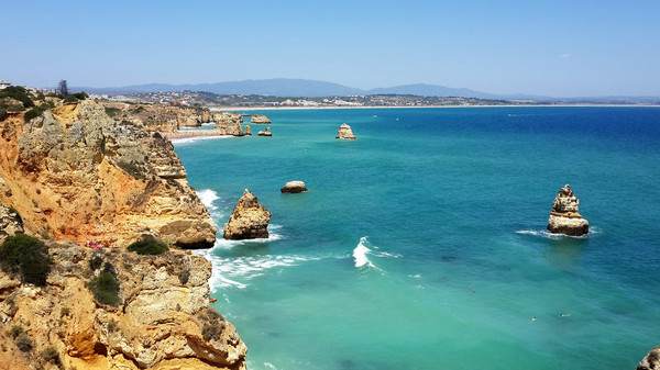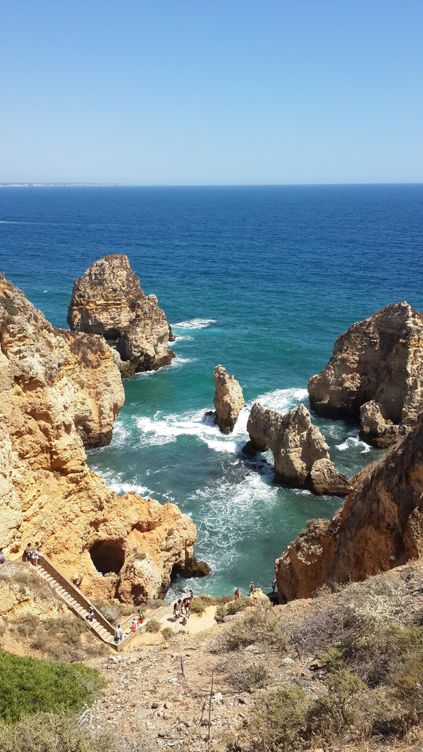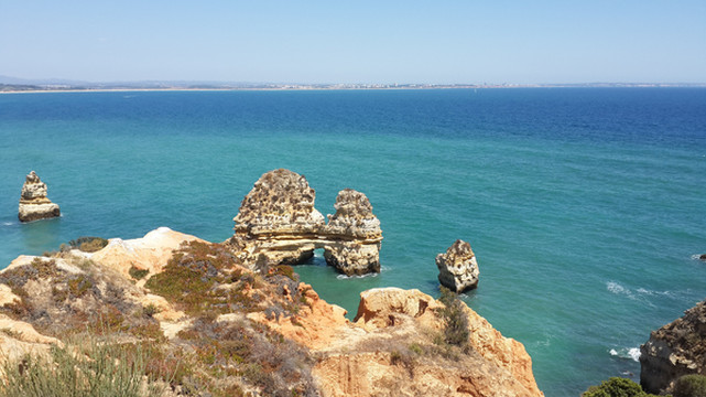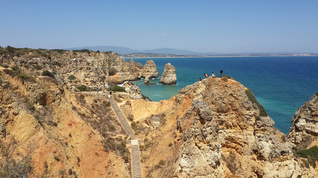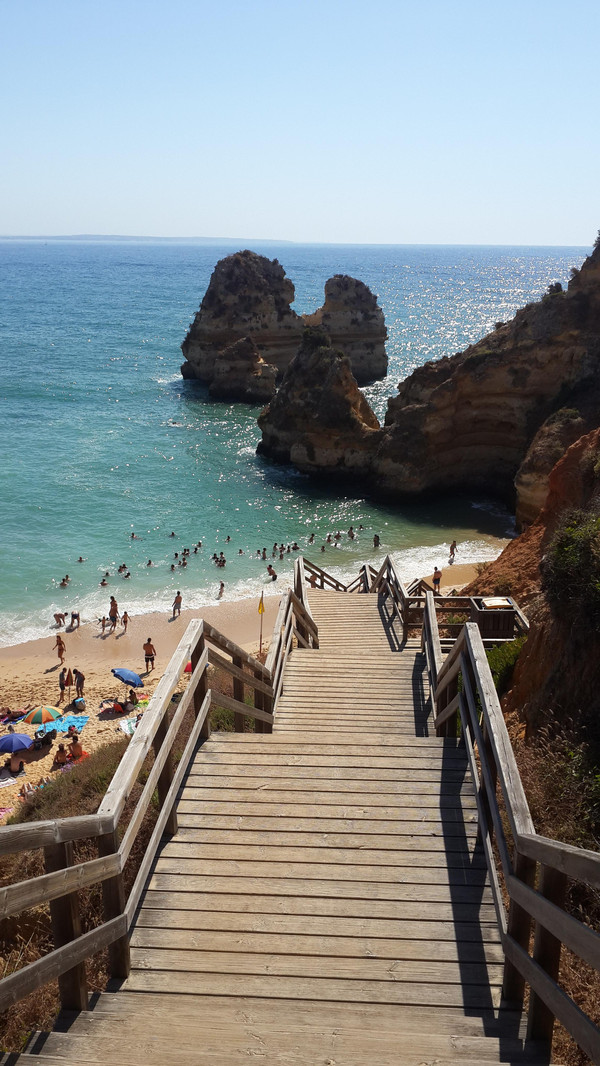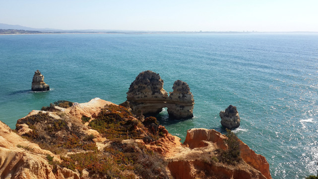 8月13日,早上十点不到,我们就驱车来到卡米洛海滩(Praia do Camilo)崖顶的停车场。停车场后即是一个观景台,站在此处观看,只见的海崖顶上散落着一窝窝垫状地上芽植物,顽强的抗争于大自然。风化腐蚀严重的砂岩大片大片的裸露在外,呈现出姜黄色、赭色和琥珀色的剥落层,清澈碧色的海水由翡翠绿转变为宝石蓝,浩瀚无边,天水共一色,沿岸海面上散落着形状各异的风化砂岩礁石,海浪涌过,礁石旁不时泛起白色的浪花。可以看到远处海岸边长长的白色沙滩,那就是拉古什著名的长海滩(Meia Praia)。近海沙滩前耸立着一些岩石的海滩是唐娜安娜海滩(Praia Dona Ana),眼前那个几近塌陷的悬崖下的小沙滩便是卡米洛海滩。