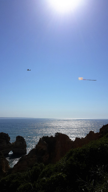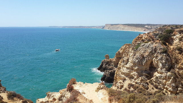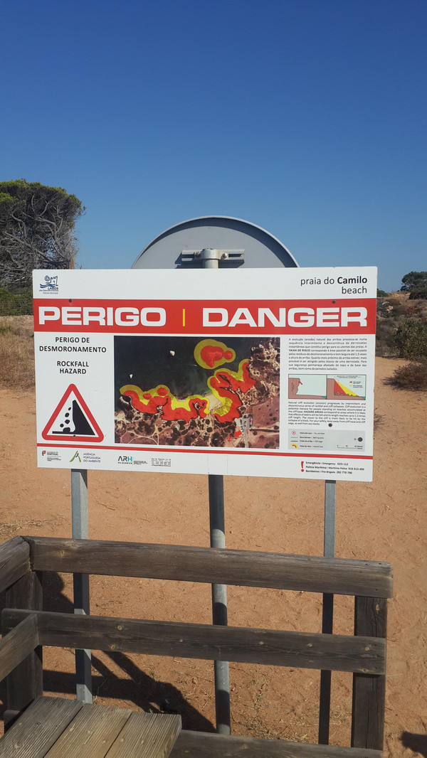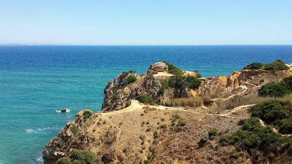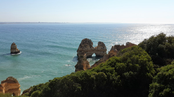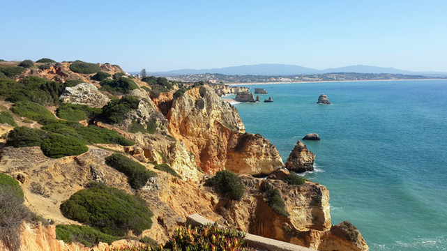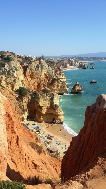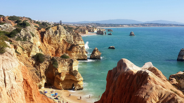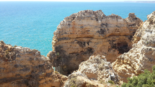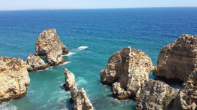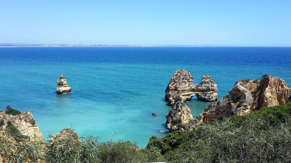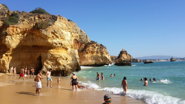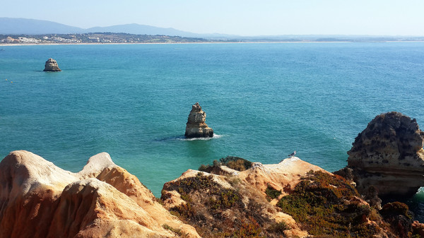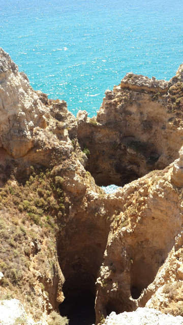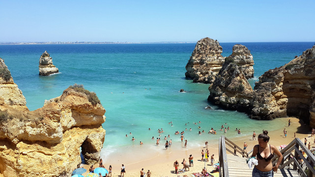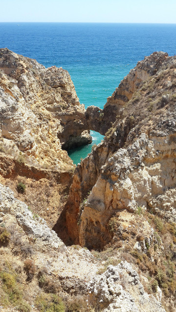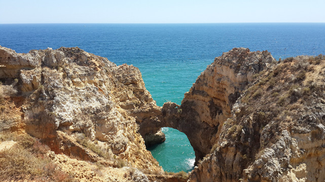 8月13日,早上十点不到,我们就驱车来到卡米洛海滩(Praia do Camilo)崖顶的停车场。停车场后即是一个观景台,站在此处观看,只见的海崖顶上散落着一窝窝垫状地上芽植物,顽强的抗争于大自然。风化腐蚀严重的砂岩大片大片的裸露在外,呈现出姜黄色、赭色和琥珀色的剥落层,清澈碧色的海水由翡翠绿转变为宝石蓝,浩瀚无边,天水共一色,沿岸海面上散落着形状各异的风化砂岩礁石,海浪涌过,礁石旁不时泛起白色的浪花。可以看到远处海岸边长长的白色沙滩,那就是拉古什著名的长海滩(Meia Praia)。近海沙滩前耸立着一些岩石的海滩是唐娜安娜海滩(Praia Dona Ana),眼前那个几近塌陷的悬崖下的小沙滩便是卡米洛海滩。