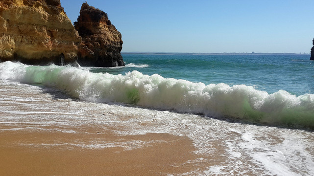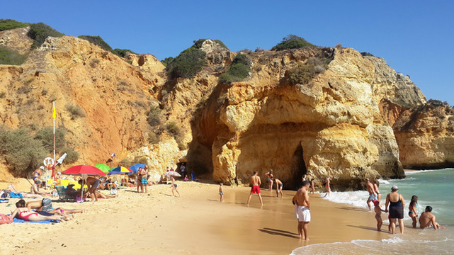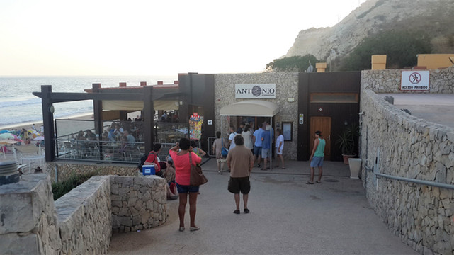 安东尼奥餐厅在蓬达彼达迪岬角西面,距离我们的住处有一公里多路程,开车去那儿很方便,3分钟左右就到达了餐厅前停车场。顺着台阶走下停车场,在悬崖峭壁之下,有一条长长的沙滩,落日余晖将远处绝壁裸露的岩石和沙滩镀上一层金色,菘蓝色的大西洋广袤而深邃,不知疲倦的朝沙滩推送着一排接一排白色的海浪,脚下黄色的沙滩洁净而松软,人们三五成群的围聚在各色遮阳伞周围,这里就是波特?德?莫斯海滩(Praia de de Mós)。