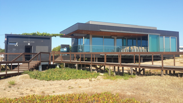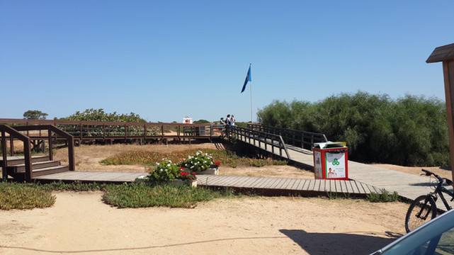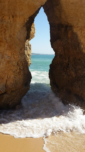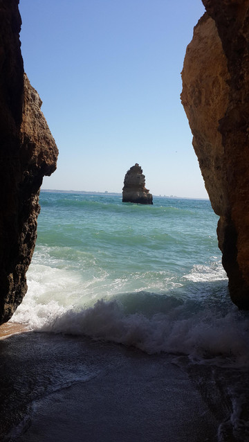 蓬达彼达迪岬角西南面的海滩通称圣玛丽亚海滨,除过波特?德?莫斯海滩,还有一个同样美丽的小海滩,叫普拉亚做坎尼亚维尔(Praia do Canavial)沙滩,两个海滩被蓬达彼达迪岬角上一个悬崖头分隔开来,普拉亚做坎尼亚维尔沙滩面积比较小,经常人满为患。波特?德?莫斯海滩除了有租借遮阳伞、沙滩椅的商铺,还设有围绕蓬达彼达迪岬角海上巡游的游艇,我们到达海滩时间太晚,巡游游艇售票处已经关门下班。