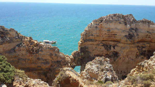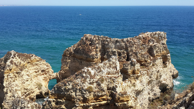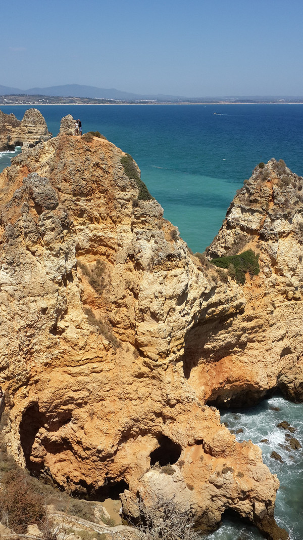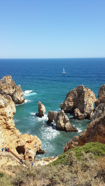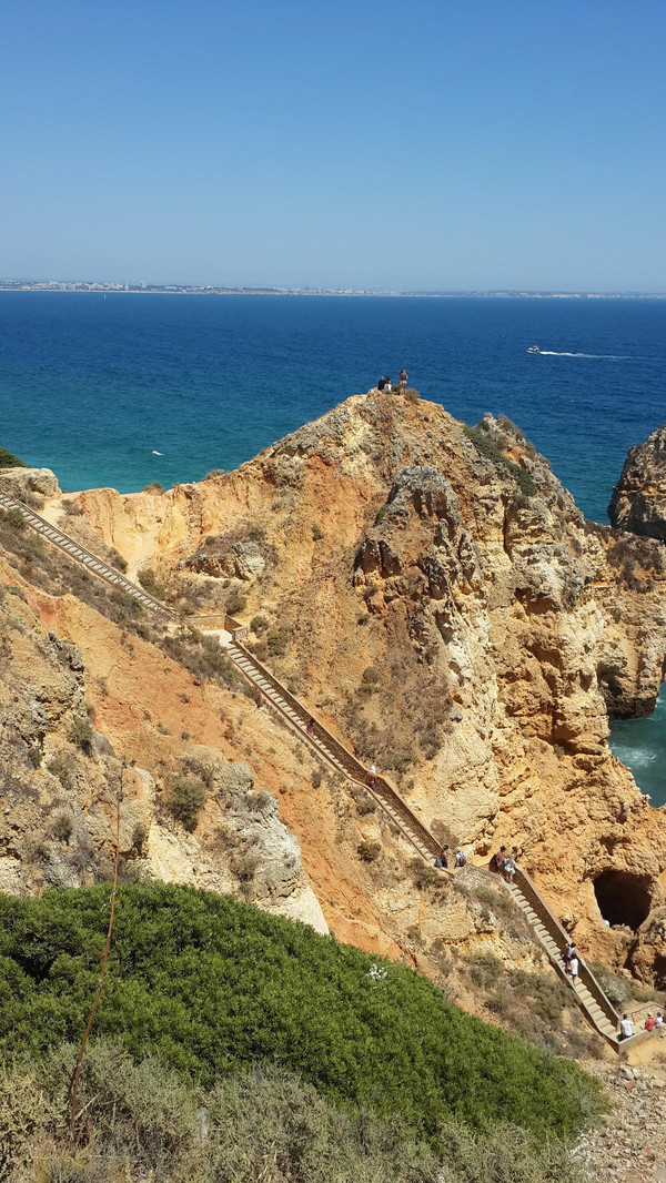 我们站在崖顶安全之地,眺望东方,有游船自拉古什长海滩(Meia Praia)发出,绕过蓬达彼达迪岬角,驶向西方波特?德?莫斯海滩(Praia de Porto de Mós)。整个行程约三、四十分钟,安德烈问我想坐船否!欲下栈道探险乎!皆否之。能够在此不毛之地,静静品味领略大自然如此壮观之美景,足矣!