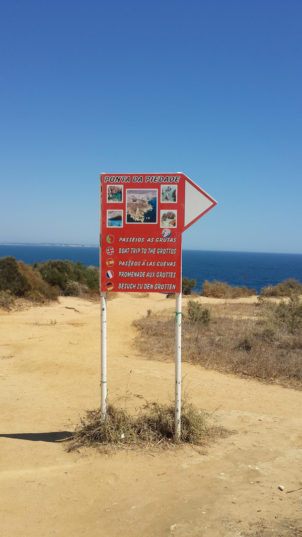 卡米洛海滩距离蓬达彼达迪灯塔(Farol da Ponta da Piedade)很近,不到一公里,我们决定顺路前去看看。沿着那条唯一的公路走下去,到达灯塔大门围墙前,那儿有一个大的停车场,停车场外竖着一块《乘船游览洞穴》(boat trip to the grottos)的指示牌。