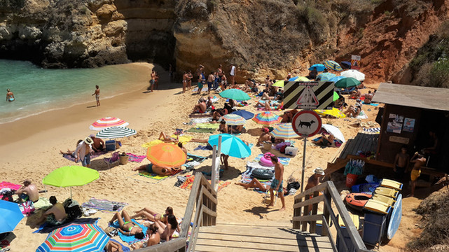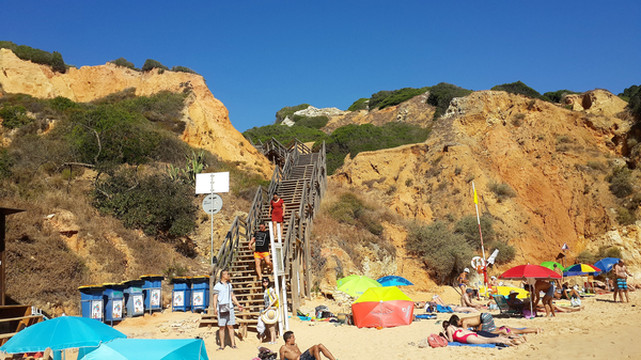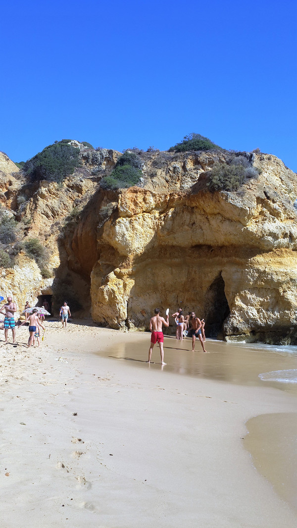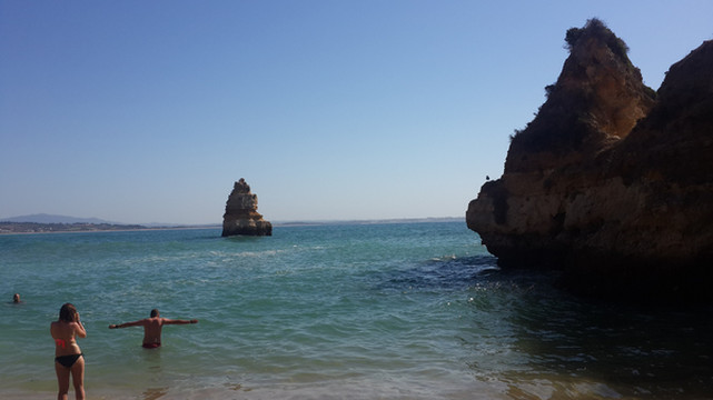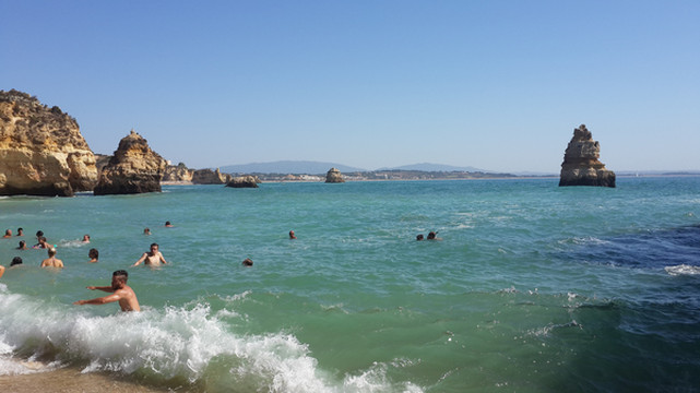 栈道地势并不险峻,沿着台阶拾极而下,很快来到崖底。卡米洛海滩实为袖珍海滩,目测其面积不超出六个排球场大,栈道的右手是一间简易木架房,里面租赁太阳伞、沙滩椅之类的。我们勉强在沙滩上铺了一个床单,不是人多,真是地方太小挤不下。不过卡米洛海滩的沙子品质很好,松软细腻。海滩坡度挺大,入海没几步远,水深已经过腰,海水清亮,水质可谓一流,由于蓬达彼达迪岬角挡住了大西洋寒流,故此这里水温没有葡萄牙西海岸边那种冻骨的感觉。