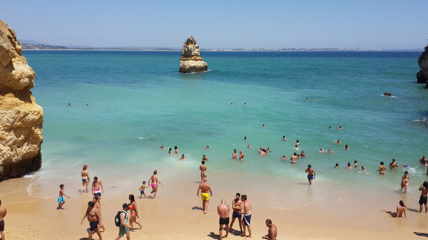 站在崖顶四下鸟瞰,只见大洋远海湛蓝,近海碧绿,深浅颜色泾渭分明。估计礁石前海域水不深,可以看到许多人都在那里游泳。眺望拉古什方向,唐娜安娜海滩(Praia Dona Ana)上人如虫蚁,密密麻麻一片,不过那片海域明显设置了安全防护线。