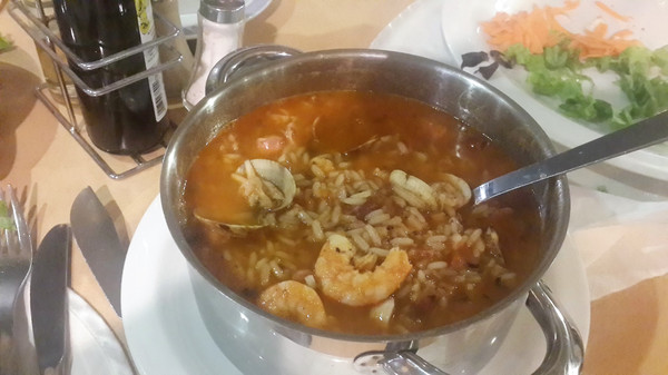 波特?德?莫斯海滩设有两家餐厅,停车场西面的是安东尼奥餐厅,东面的为坎汀玛尔餐厅酒吧( Campimar Restaurante Bar)。我们就近走入安东尼奥餐厅,正是晚餐时间,就餐客人较多,排队轮到我们时,一个中年服务生态度很不友好,说需提前两天订位,旅游区内哪能这样!明显是胡说八道。旁边一位老年服务员特别好,一面批评那人,一边开着玩笑安抚我们,很快安排我们入座。而这家餐厅的海鲜饭味道还真的不错。