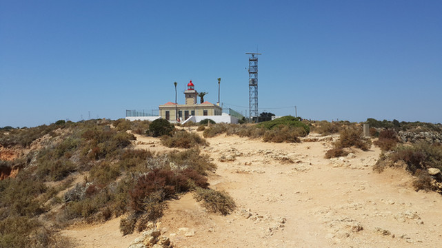 绕过停车场前的餐厅、小卖部和纪念品商店,来到蓬达彼达迪灯塔的后面。蓬达彼达迪灯塔是一座历史悠久的古老灯塔,承担着蓬达彼达迪岬角四围海域渔业、航运的安全。灯塔本身是向公众开放,不过我们没有进去参观。